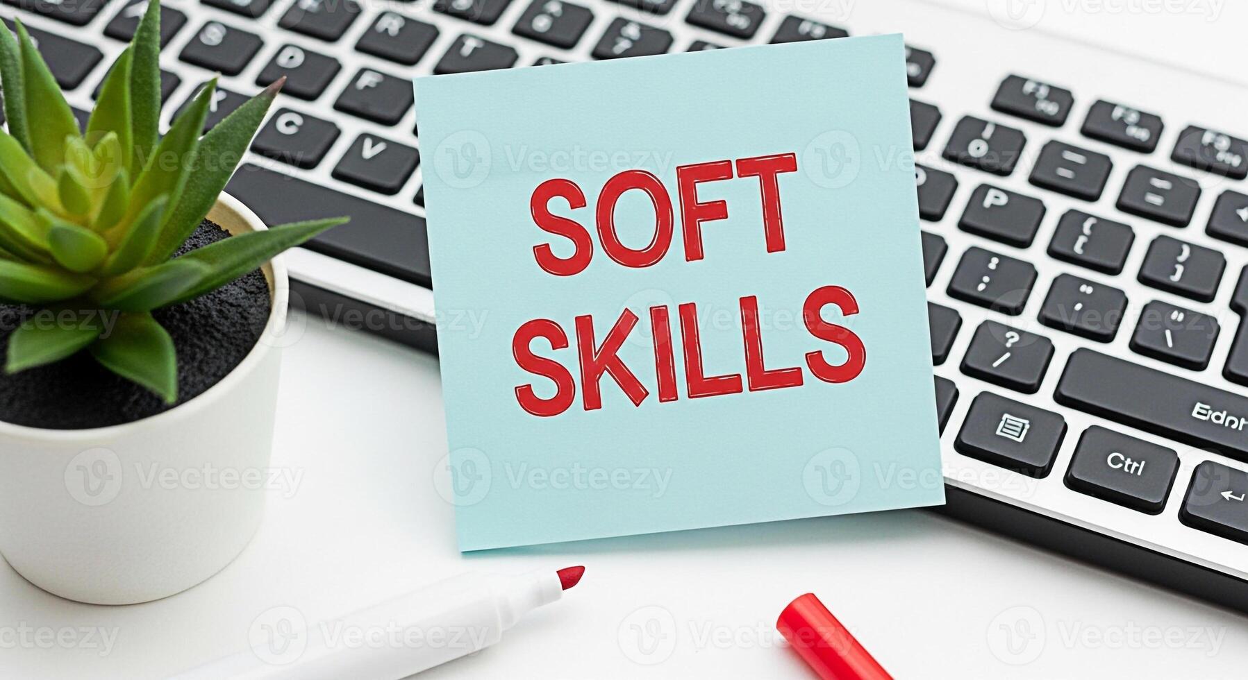 Closeup of a sticky note displaying Soft Skills on a white desk with a keyboard plant and markers emphasizing the importance of interpersonal skills in a modern workplace environment Pro Photo