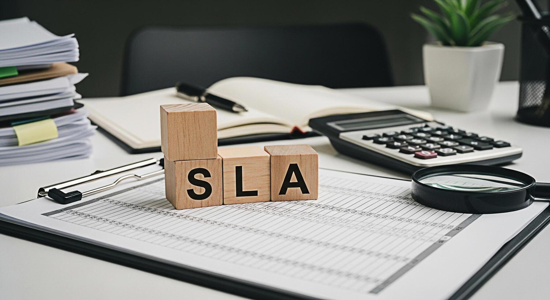 Wooden blocks spelling SLA resting on a financial report in a bright office environment symbolizing service level agreement and business efficiency with a calculator and documents in the background Free Photo