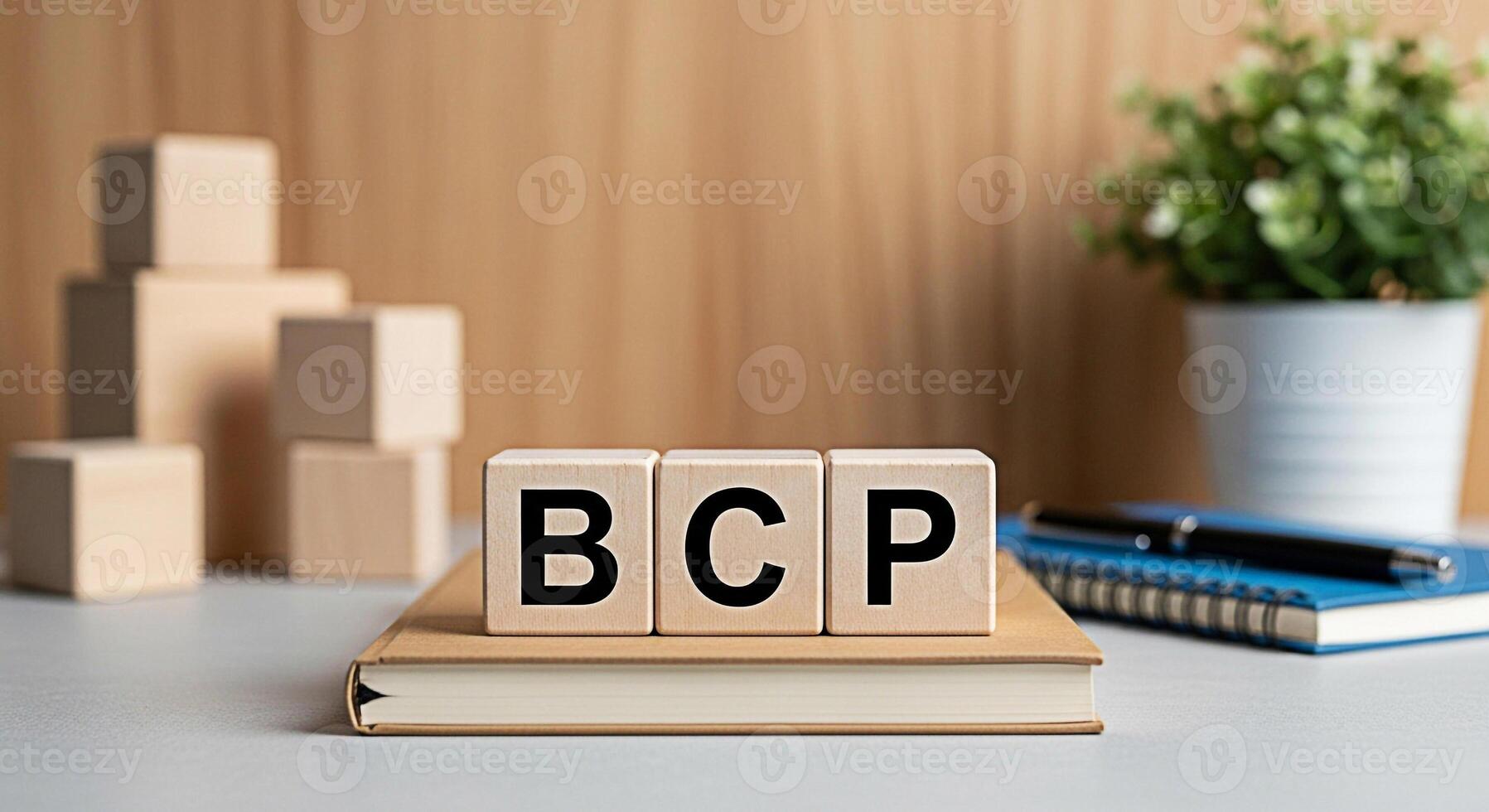 Wooden blocks displaying BCP on a book in a bright office setting symbolizing Business Continuity Planning and resilience with a focus on preparedness and strategic management for successful operation Pro Photo