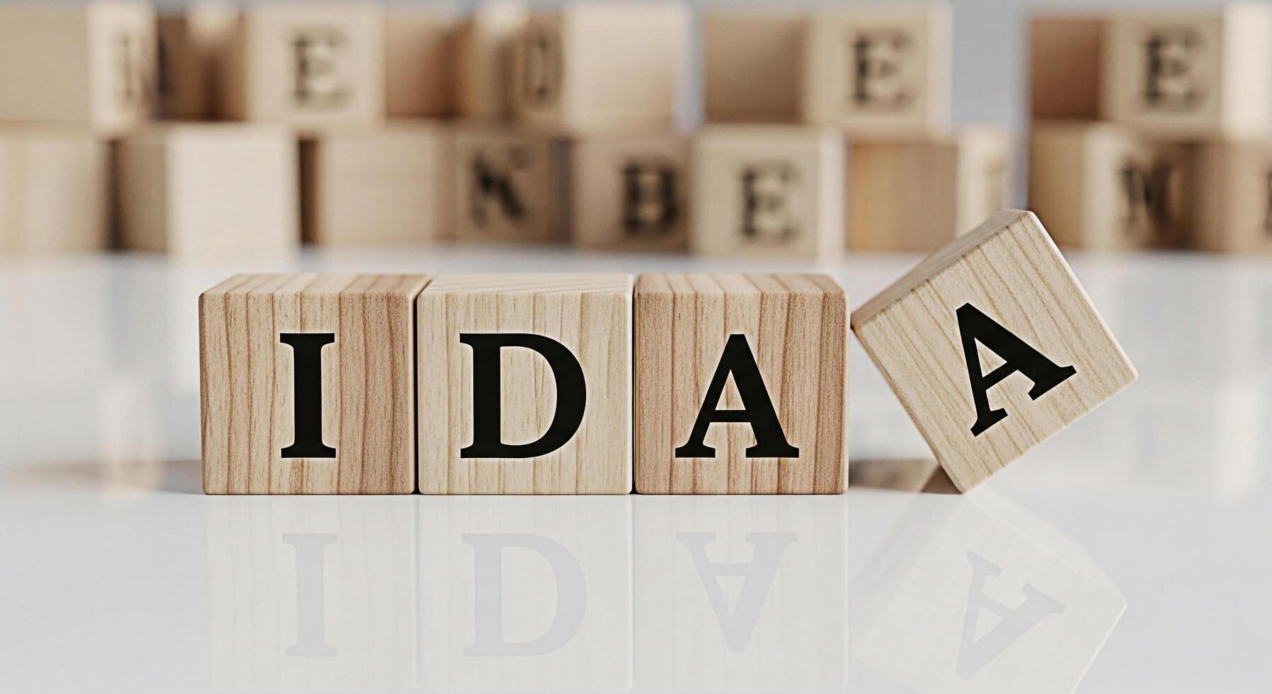 Wooden blocks spelling out IDEA on a reflective white surface symbolizing creative thinking and innovation in a bright minimalist studio setting promoting inspiration and problemsolving photo