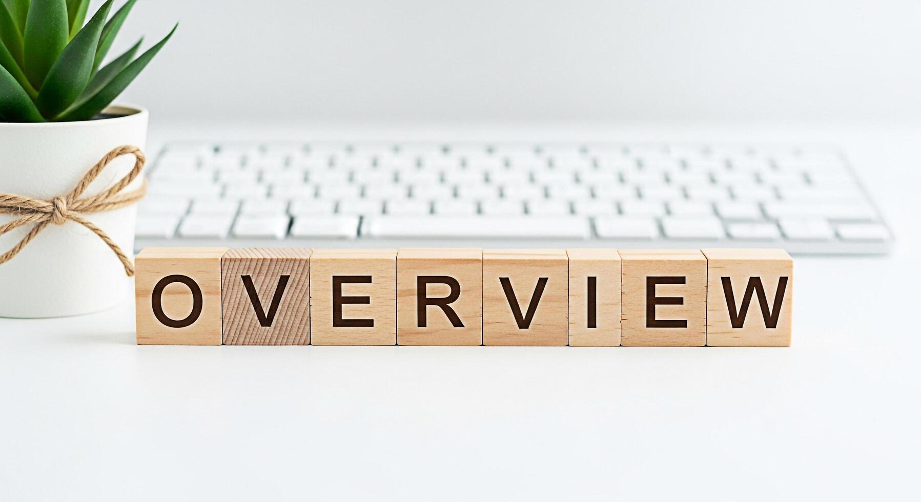 Wooden blocks spelling Overview on a white desk with a keyboard and a potted plant representing a summary analysis or a general understanding of a topic in a clean and professional setting photo