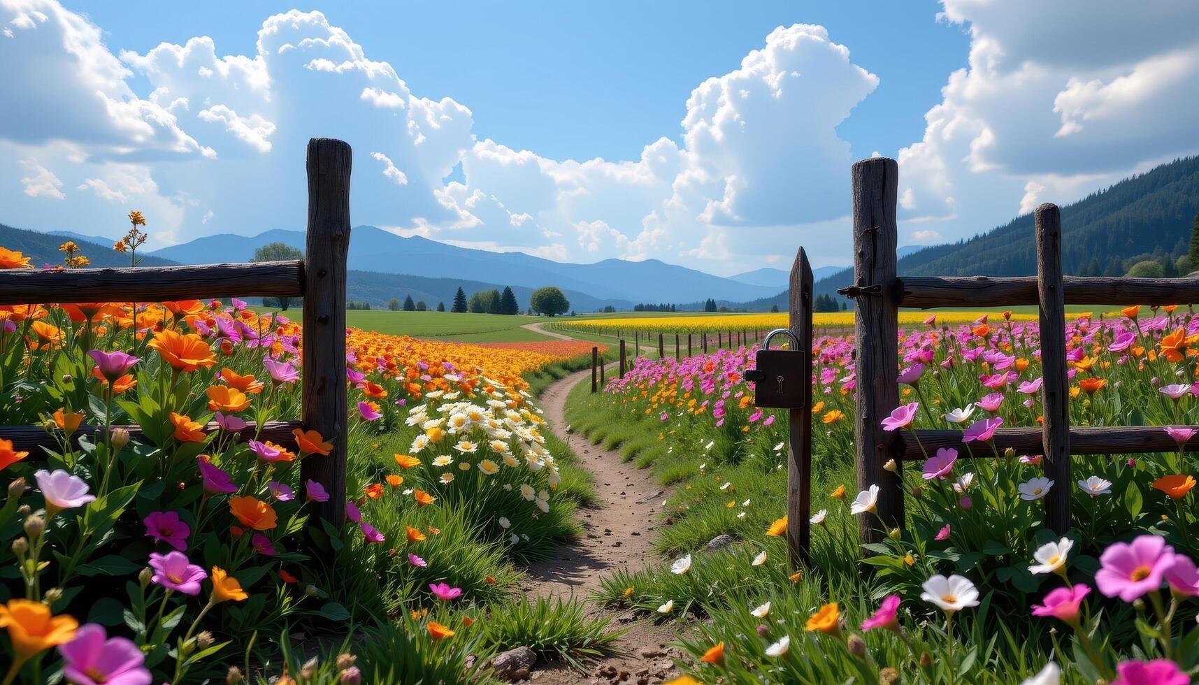 A locked gate hints at secret paths inside the flower field, making the fence feel like both protector and tease. photo