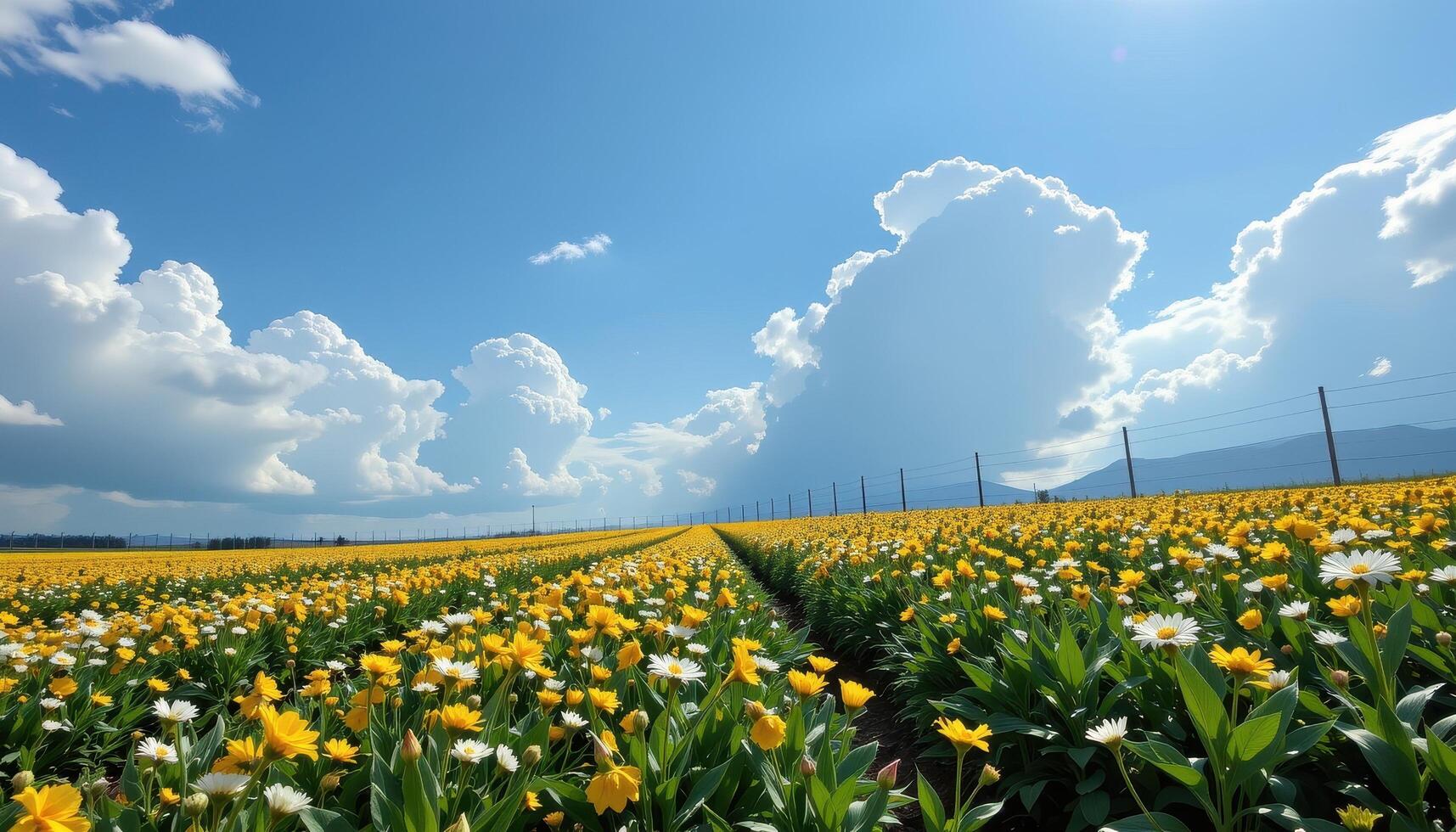 Clouds drift overhead, casting moving shadows across the fenced flower field, shifting the colors in subtle ways. Free Photo