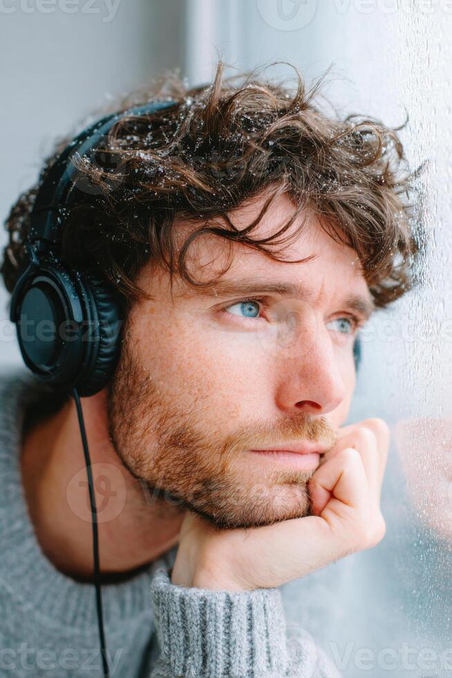 Man with headphones gazes thoughtfully out the window, reflecting on life while wearing a cozy sweater, creating a serene and introspective atmosphere with soft natural light Pro Photo