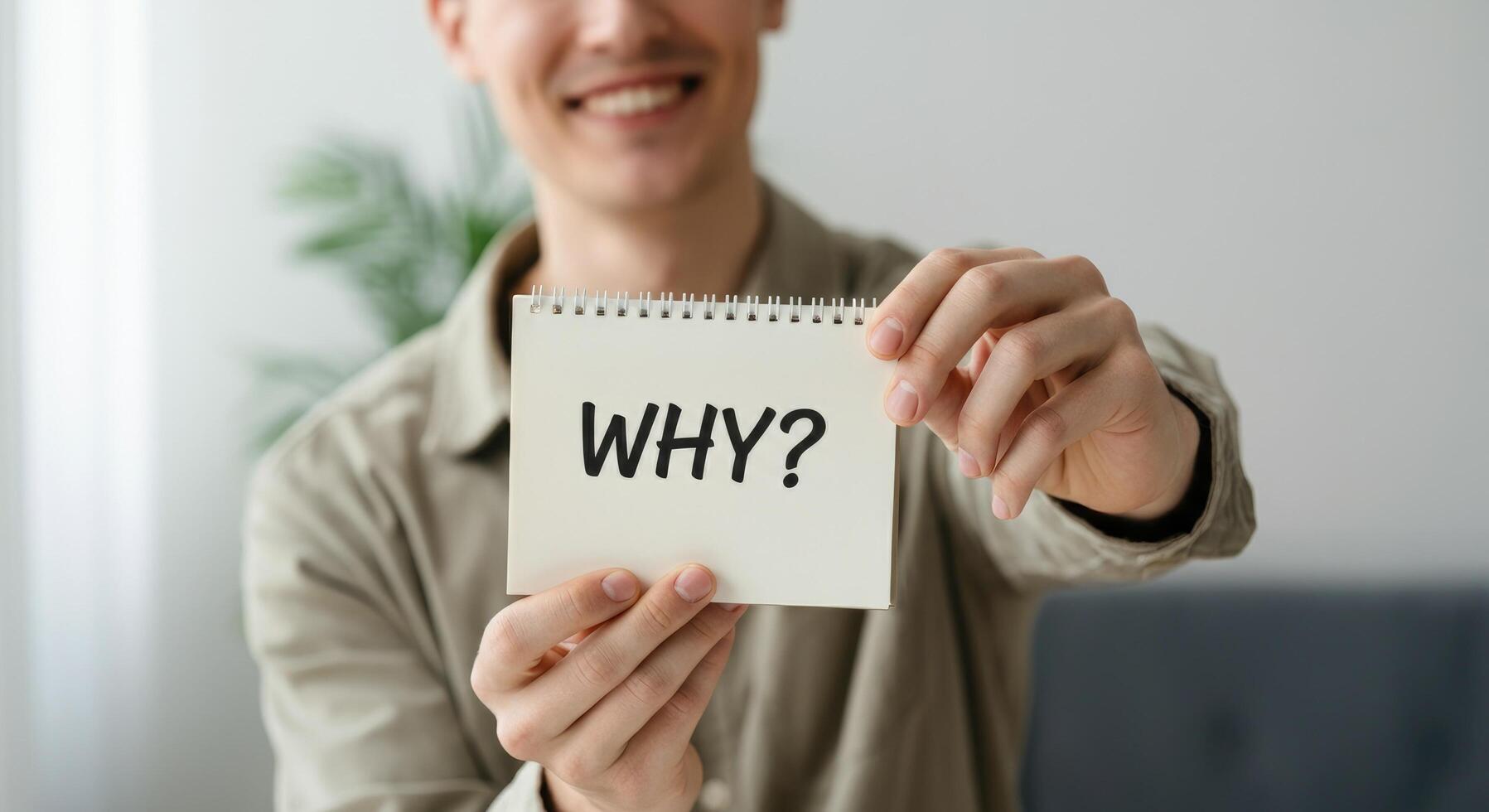 Smiling person holds notebook with WHY written on it, symbolizing curiosity and questioning photo