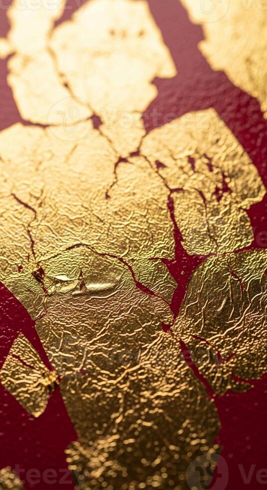 Close up textured view of cracked gold leaf applied to a deep red surface creating a luxurious and abstract pattern Pro Photo