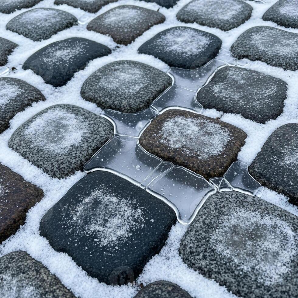 Close up view of dark cobblestones covered in a light dusting of fresh snow creating a textured winter ground pattern Pro Photo