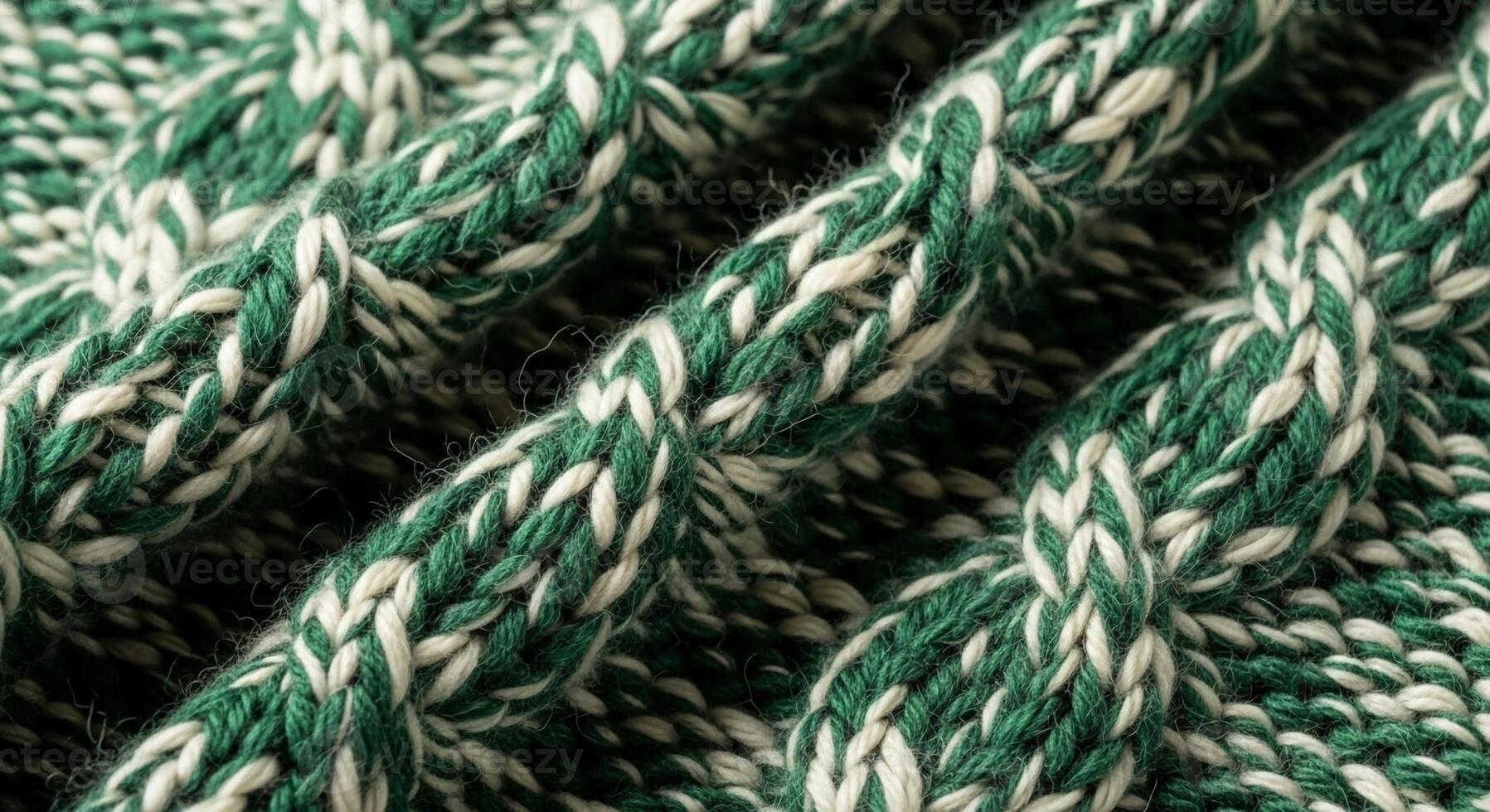 Close up view of a textured green and white knitted fabric with a cable knit pattern creating depth and visual interest Pro Photo