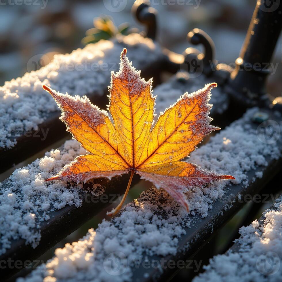 The is a closeup of a single orange maple leaf resting on a black metal railing covered in snow. The leaf is in the center of the with its stem and leaves facing towards the right side of the frame. Pro Photo