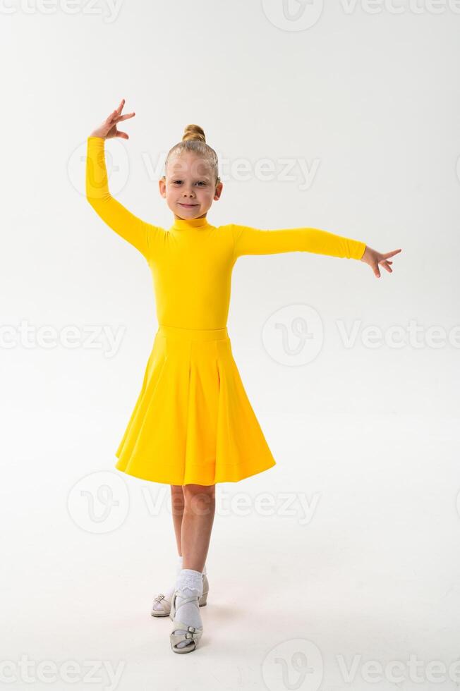 Smiling child girl in bright yellow practicing choreography with hearing device. Confidence, concentration, and harmony of movement despite deafness, showing inclusion and technological progress in Pro Photo