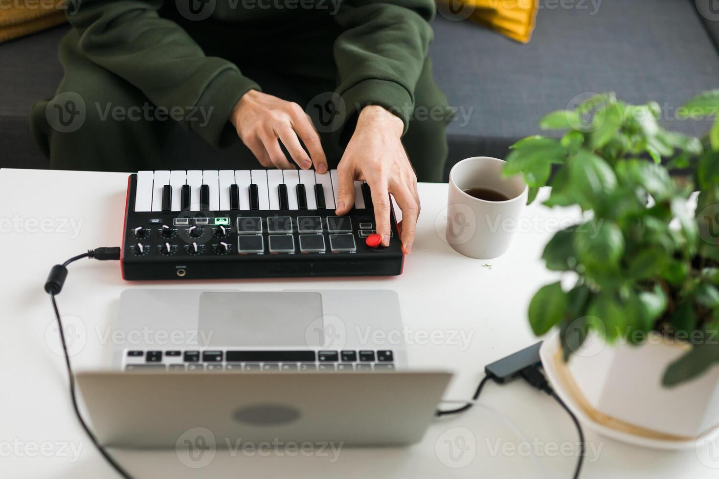 Top view of music producer or arranger using laptop and midi keyboard and other audio equipment to create music at home studio. Beat making and arranging audio content and composing song concept. Pro Photo