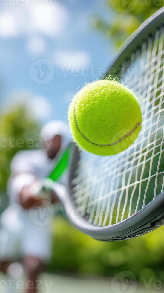Vibrant tennis ball is captured in motion, showcasing its bright green color as it approaches racket. background features blurred player ready to strike, emphasizing excitement of game Pro Photo