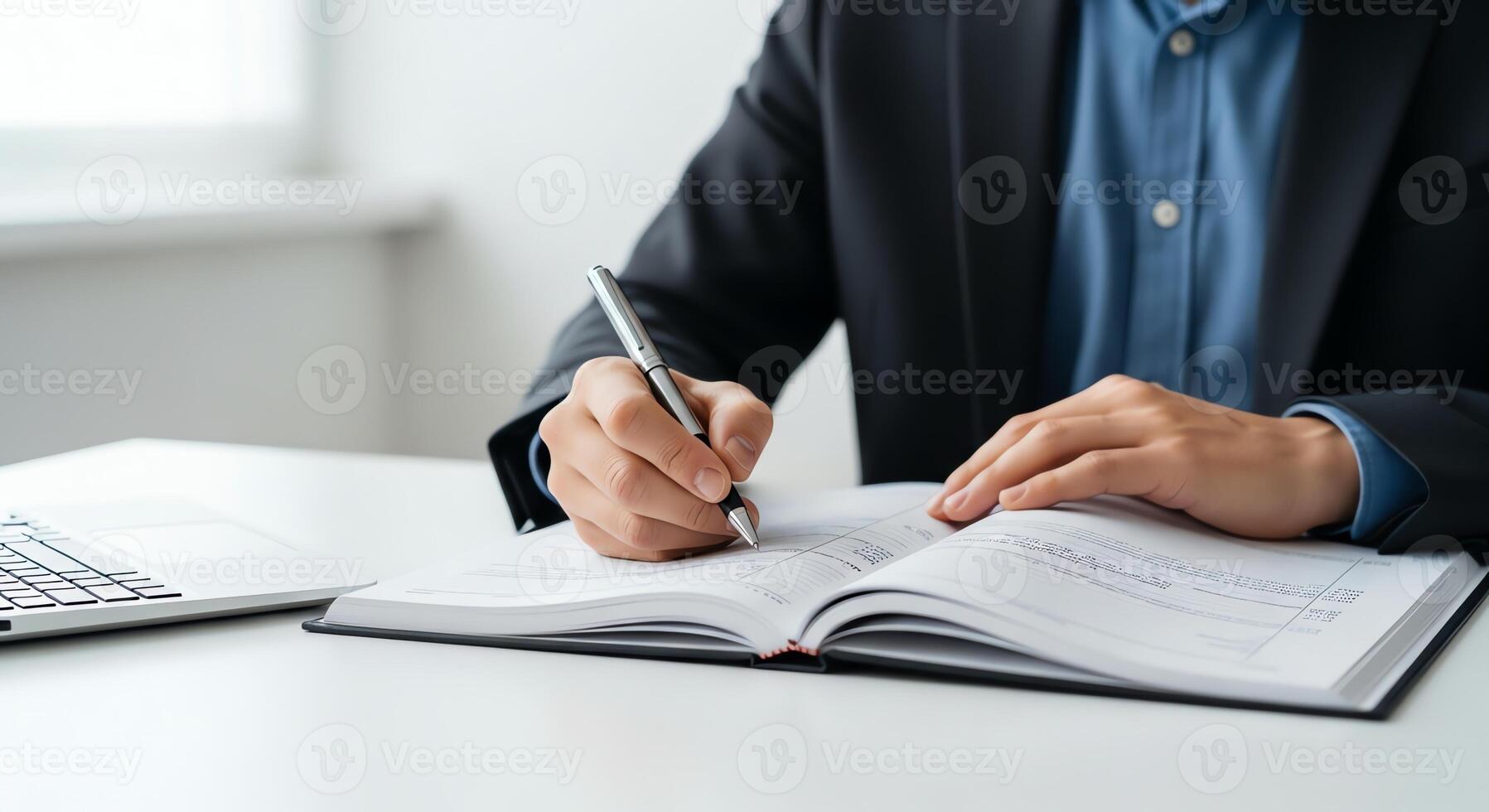Writing in a business diary, close-up of hands at a desk with laptop and notebook Pro Photo
