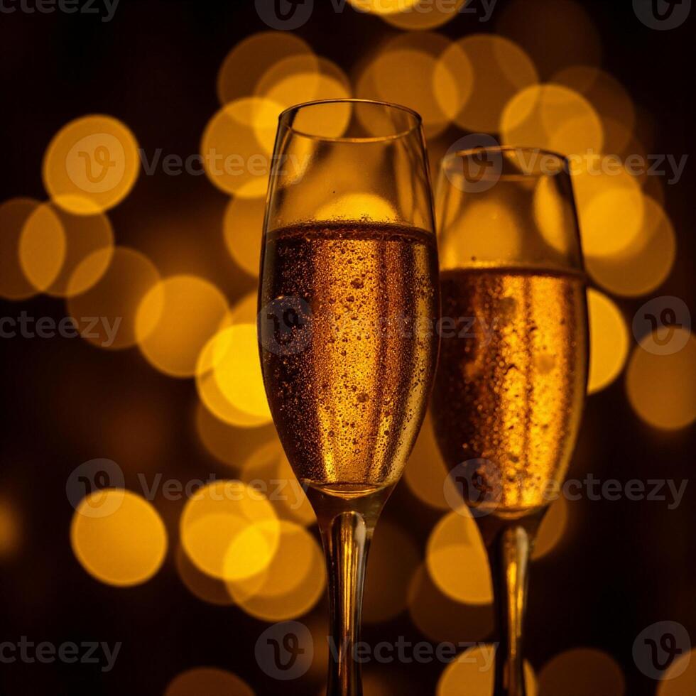 New Years Eve party atmosphere with champagne and a dense array of sparkling warm string lights Pro Photo