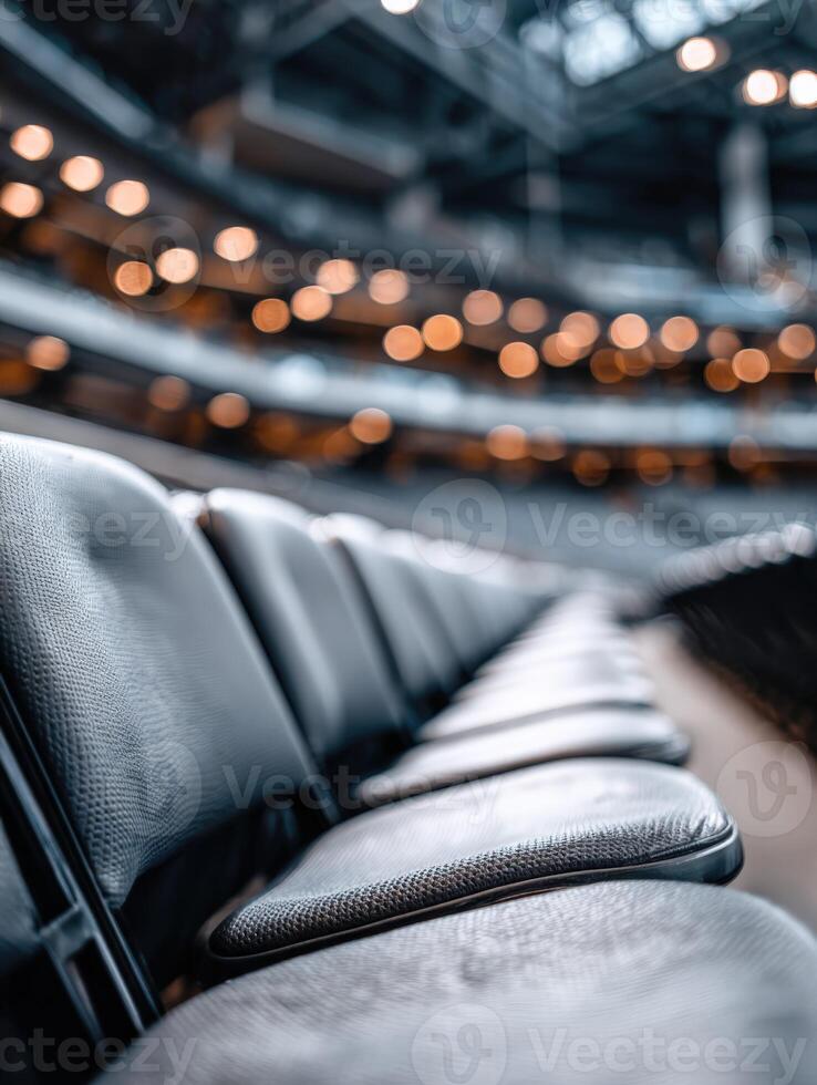 Long row of empty black seats in a large indoor arena during event setup Pro Photo