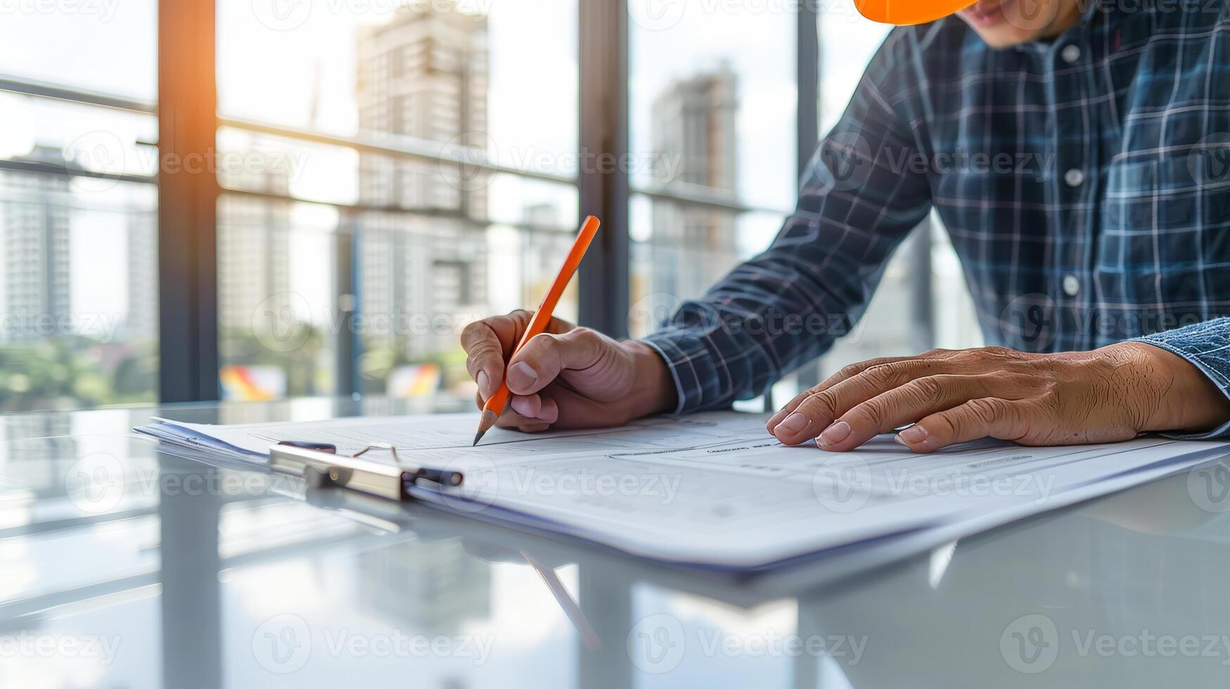 The Engineer or architect analyzing blueprints in a bright modern workspace Pro Photo