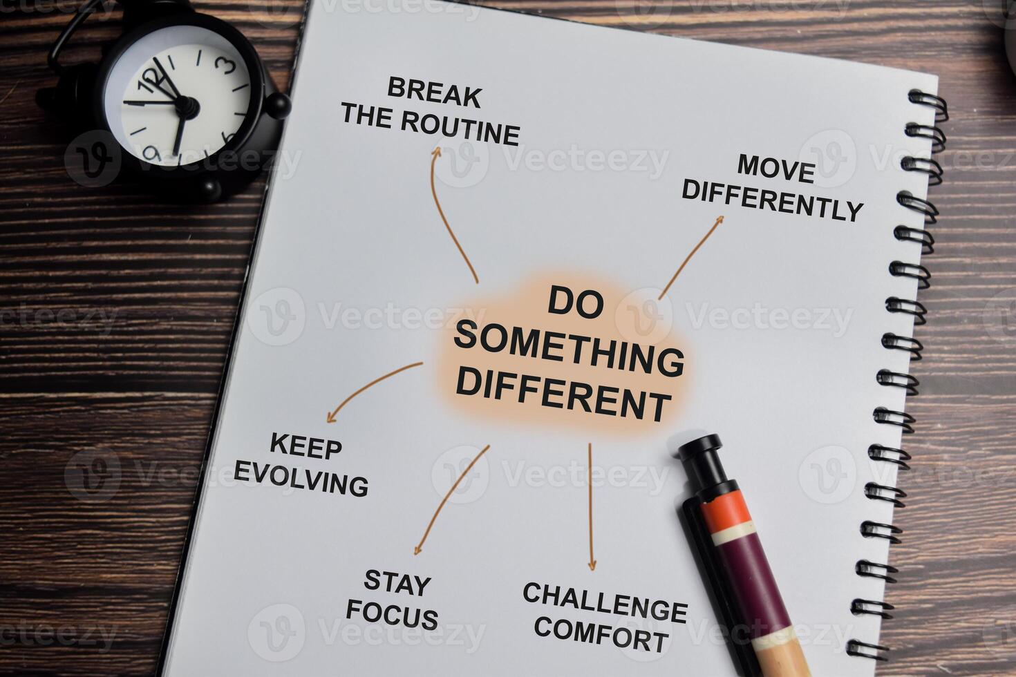 Concept of mind map. Do something different write on book with keywords isolated on Wooden Table. Pro Photo