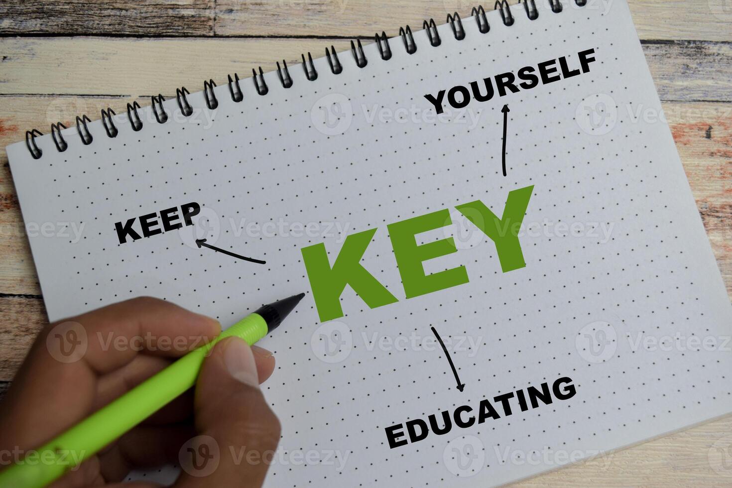 Concept of mind map KEY - Keep Educating Yourself write on book with keywords isolated on Wooden Table. Pro Photo