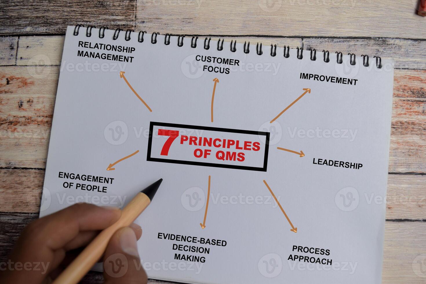 Concept of mind map 7 of principles of quality management system write on book with keywords isolated on Wooden Table. Pro Photo
