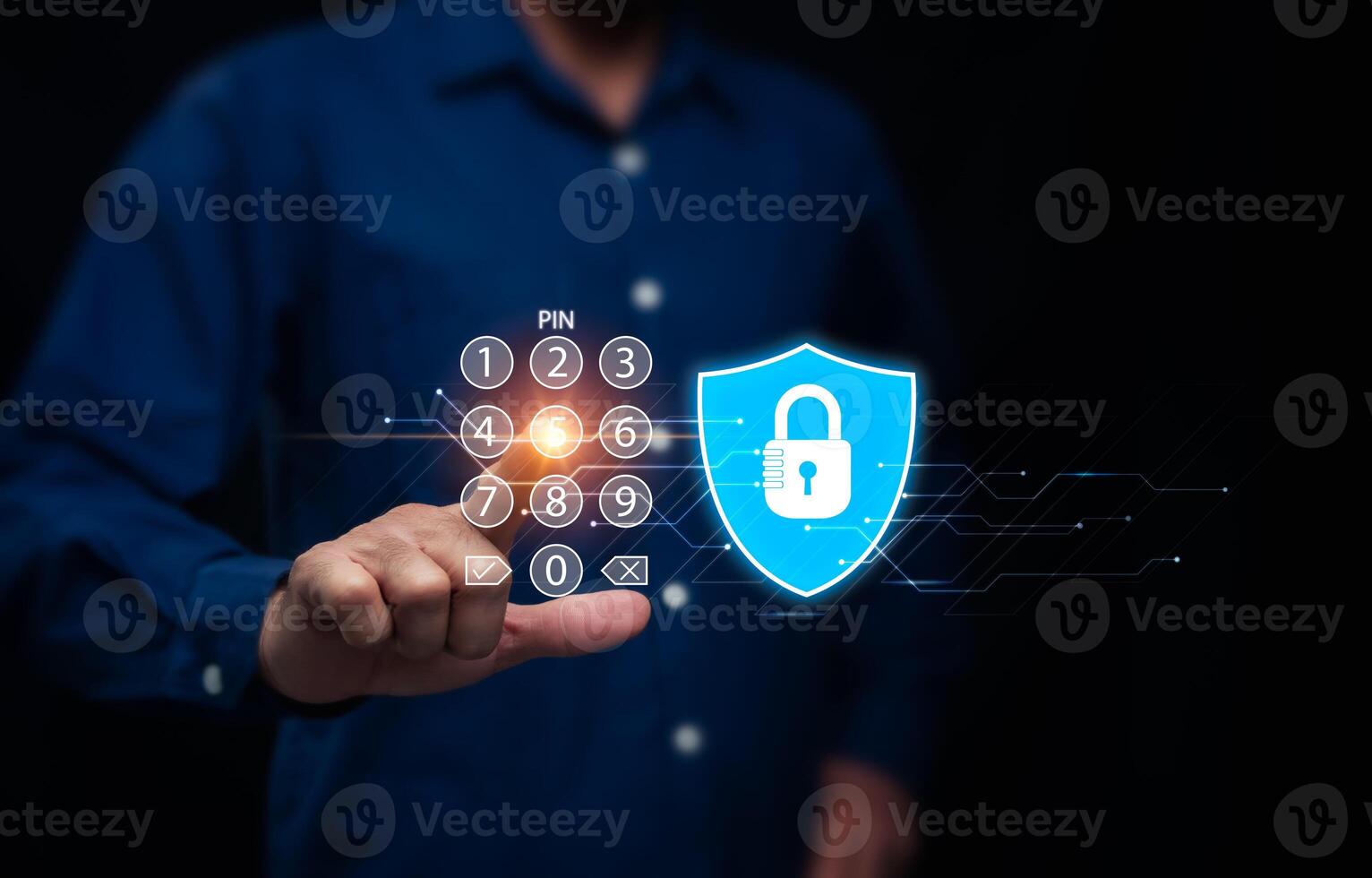 Digital security by entering a numeric code to unlock. Protecting sensitive data in financial transactions. Accessing online technology. Business people access the world's most secure software. Pro Photo
