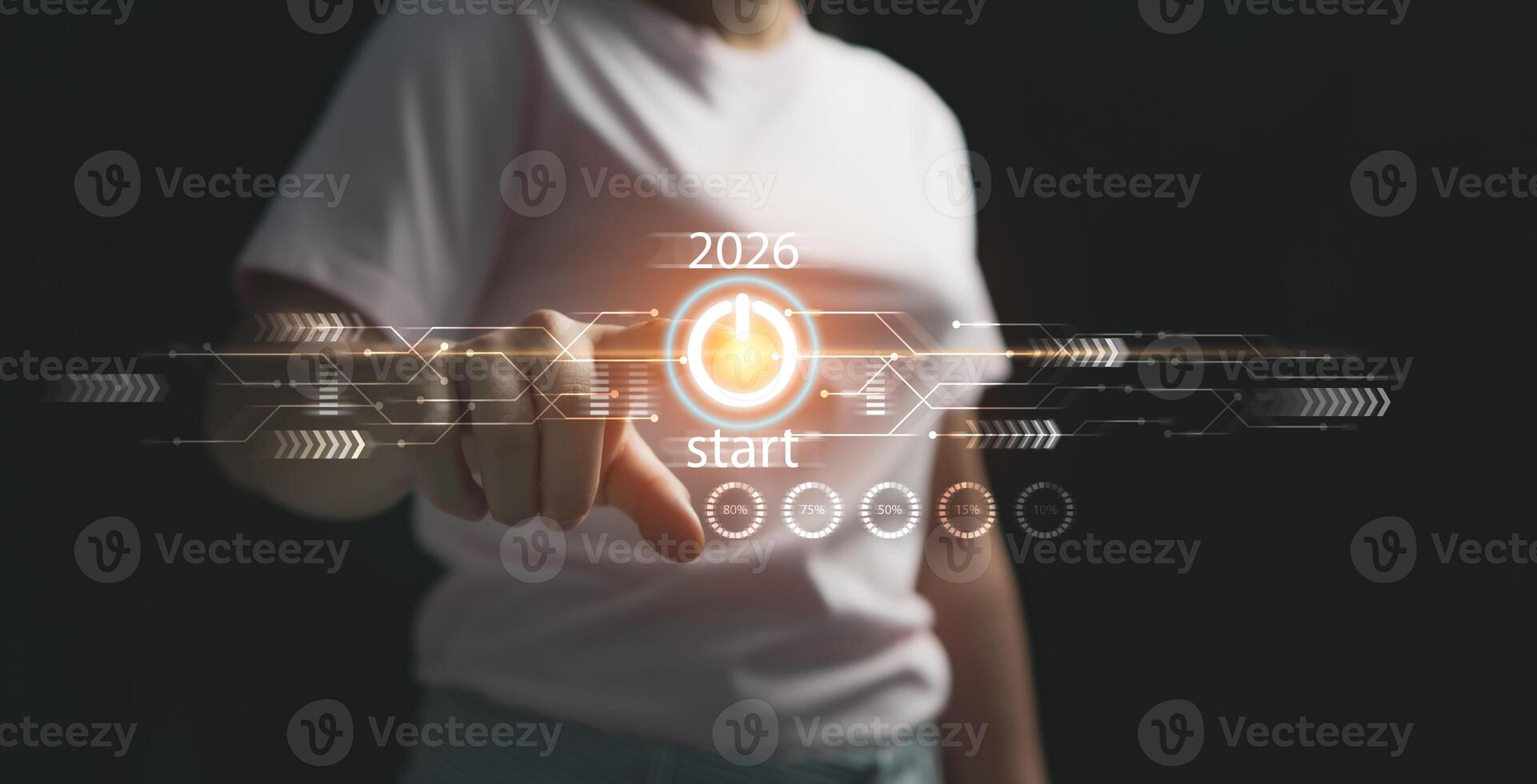 2026 Startup Concept, Power Button, Driving Business Systems to Focus on Success, Powerful Fingers Pointing to Touch Button, Command and Control at Fingertips, Hologram Virtual Icon Pro Photo