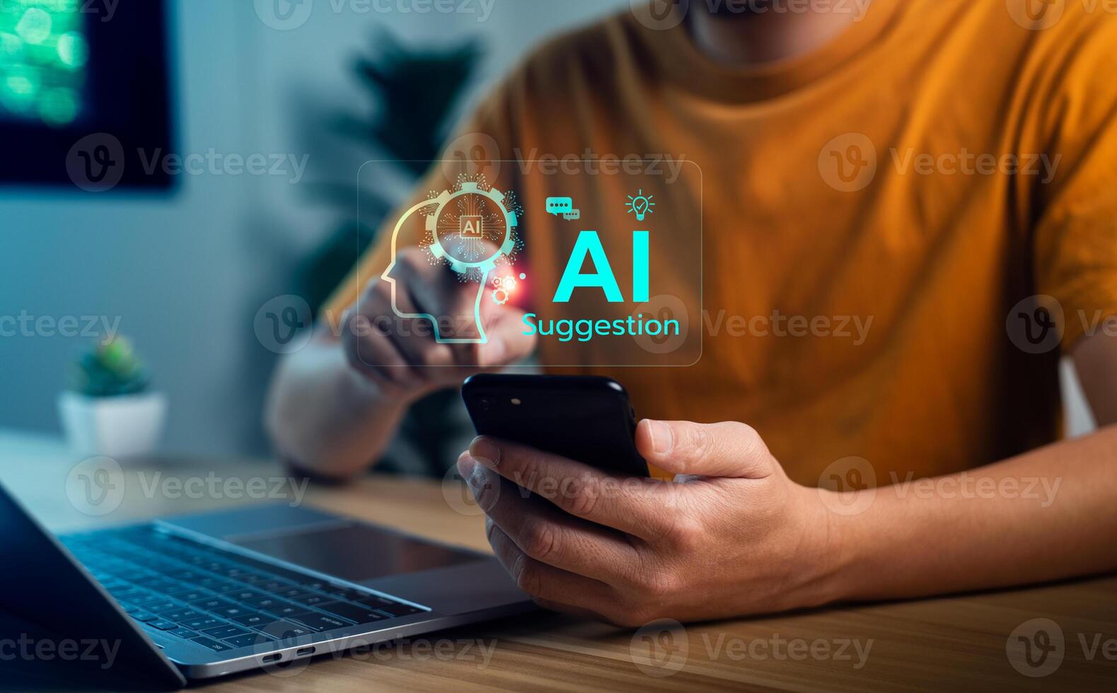 AI-powered suggestion system concept with virtual assistant interface on smartphone, showing artificial intelligence brain icon, idea symbol, and digital interaction in smart technology workspace Pro Photo