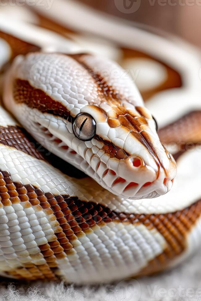 Colorful ball python resting on a soft surface in a serene setting Pro Photo