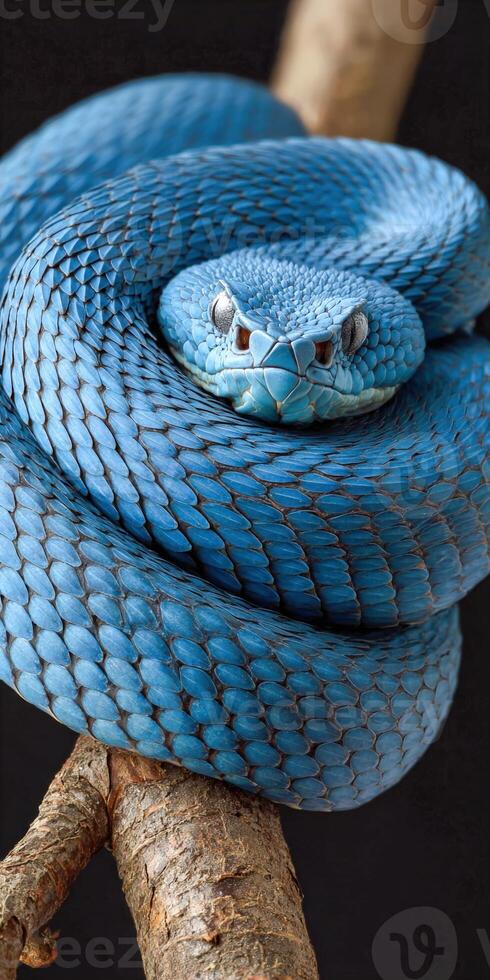 Colorful blue snake resting on a branch in a tranquil setting Pro Photo
