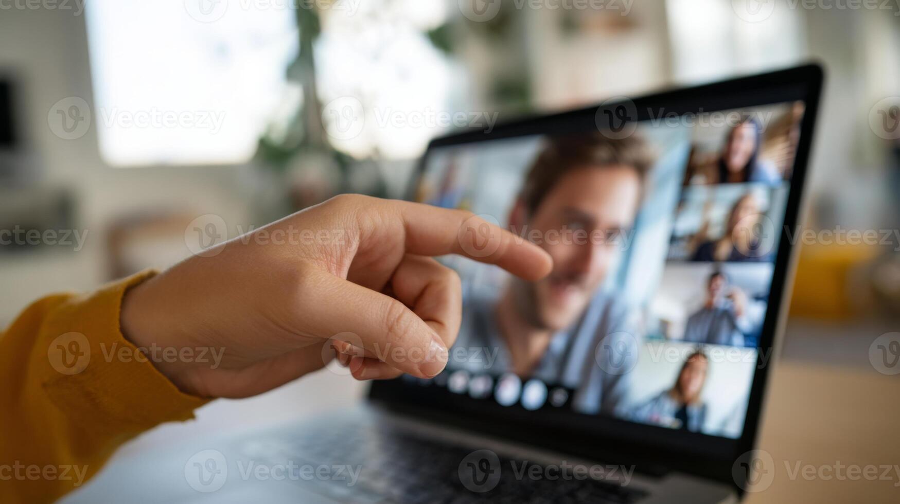 A person reaches out to touch the screen during a call, capturing a moment of connection with friends in a cozy setting. Pro Photo