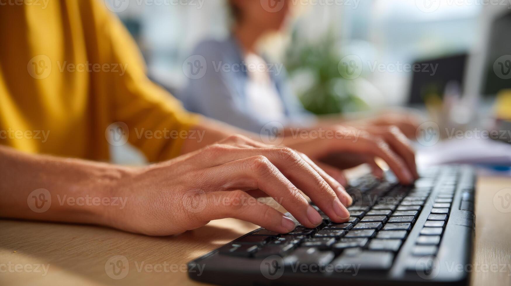 Close-up of a person's hands typing on a keyboard, creating a focused workspace ambiance with soft lighting. Pro Photo