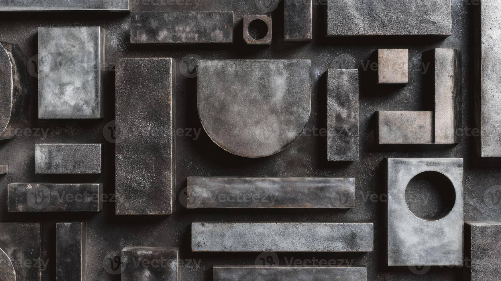 Abstract arrangement of various metallic shapes in shades of gray, creating a modern artistic composition. Pro Photo