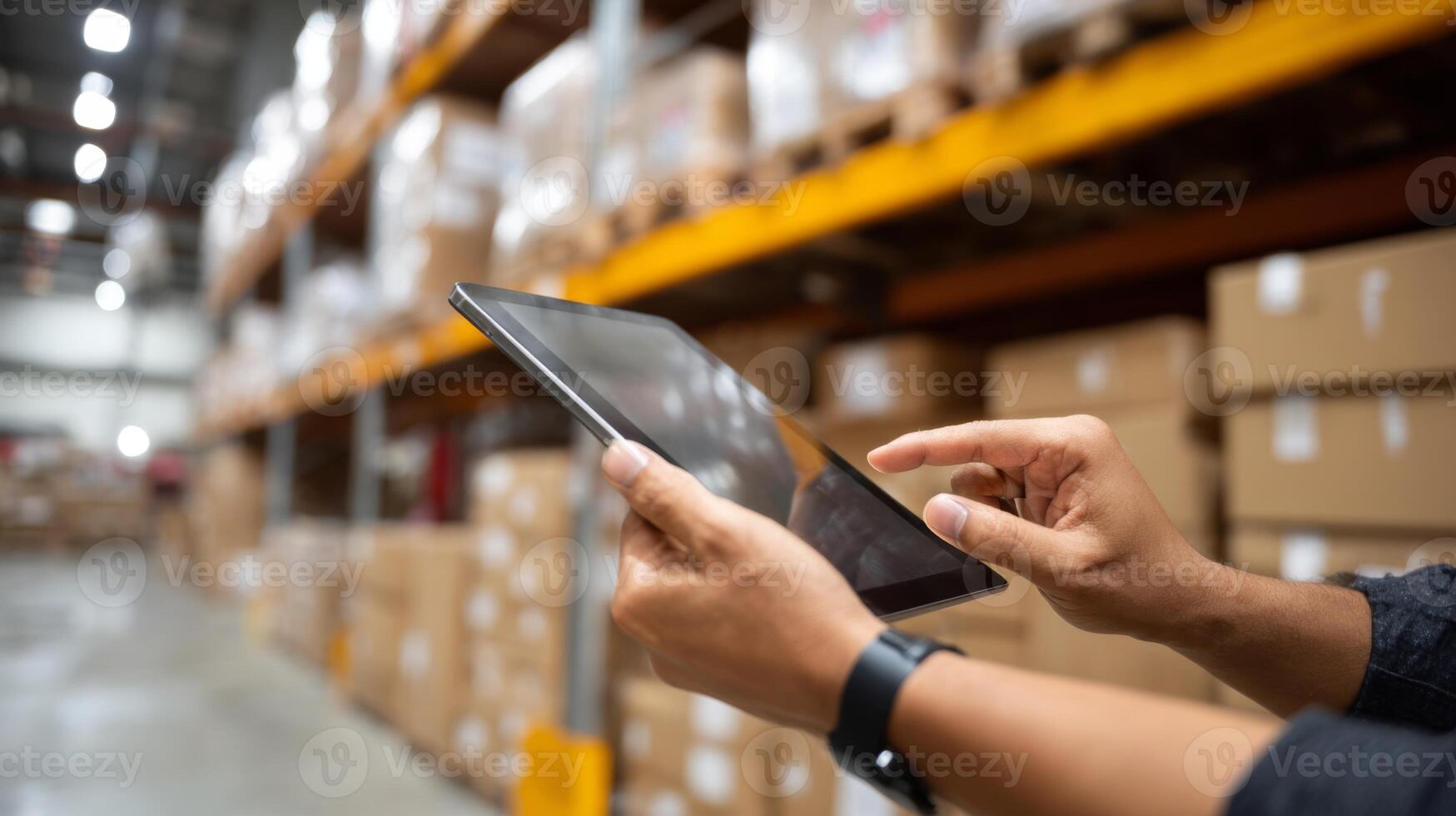 A man using a tablet to manage inventory in a warehouse filled with stacked boxes. Pro Photo