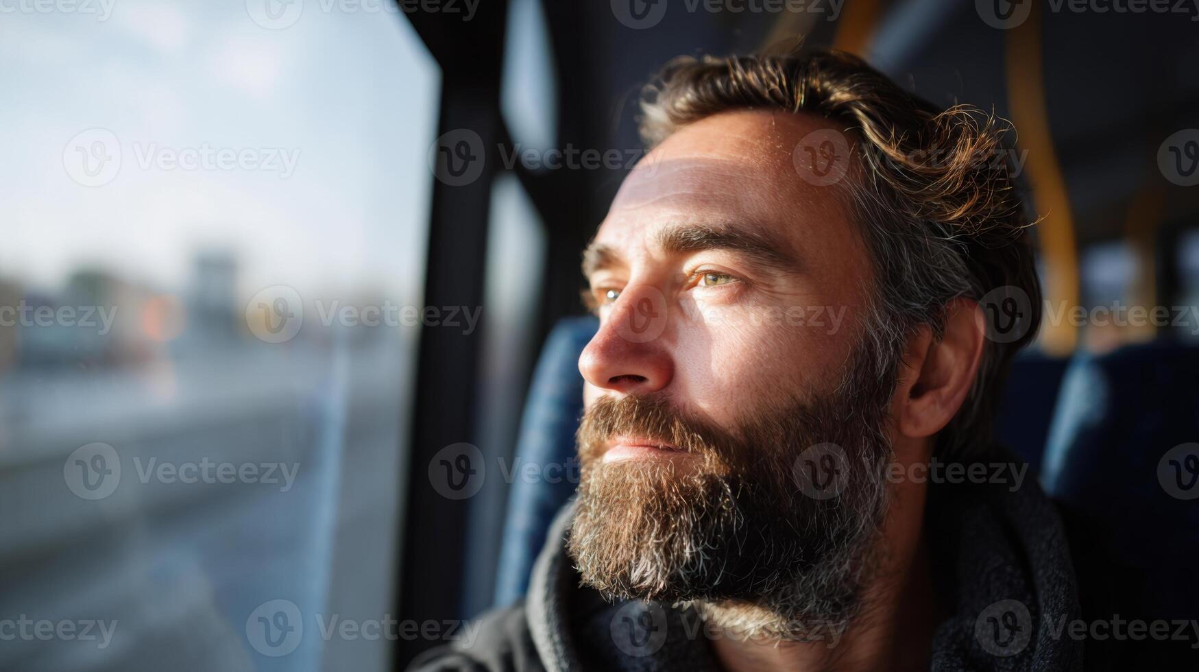 A thoughtful Caucasian man gazes out the bus window, contemplating life while enjoying warm sunlight and soft reflections. Pro Photo