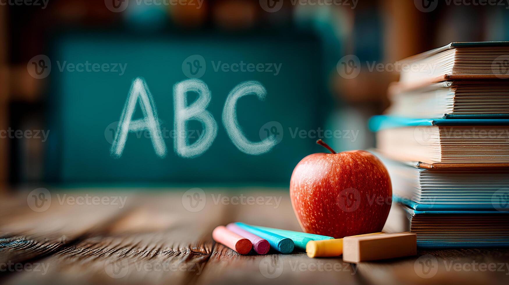 Learning tools on a wooden desk in class. A red apple sits next to colorful crayons and books on a desk, with chalkboard letters in the background. Pro Photo