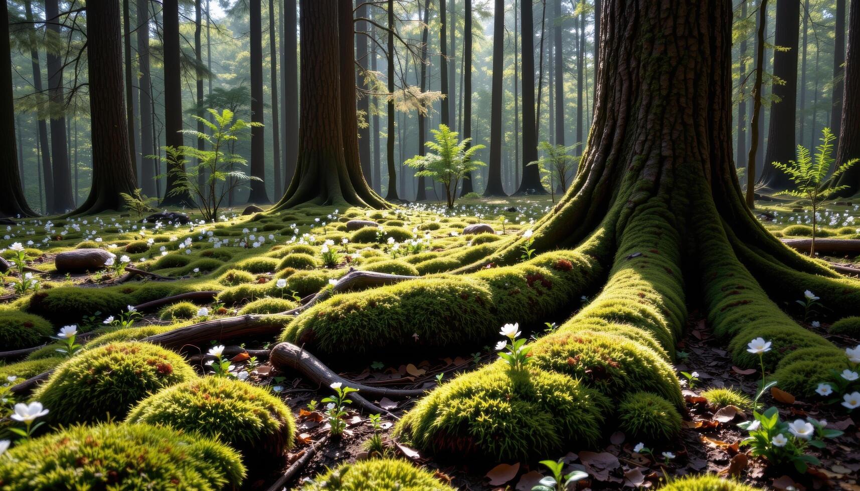 Moss blankets roots on the forest floor while scattered flowers bloom beneath towering trees in calm light. photo