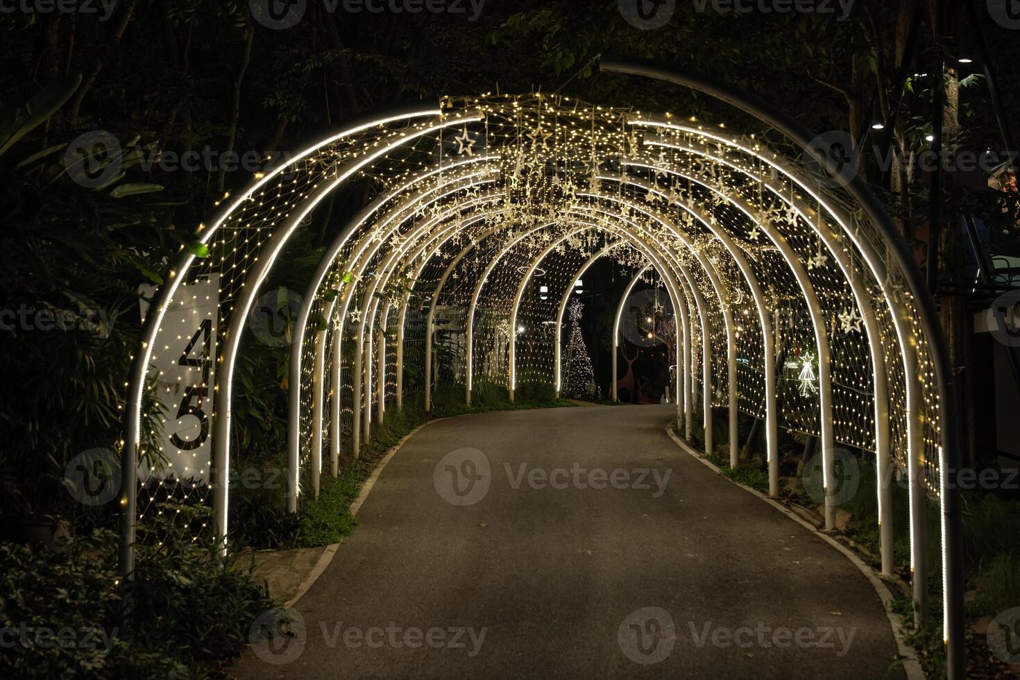Strings of tiny star lights hang across curved frames in a bright display, and the glowing ornaments form a striking pattern over the walkway.bb Pro Photo