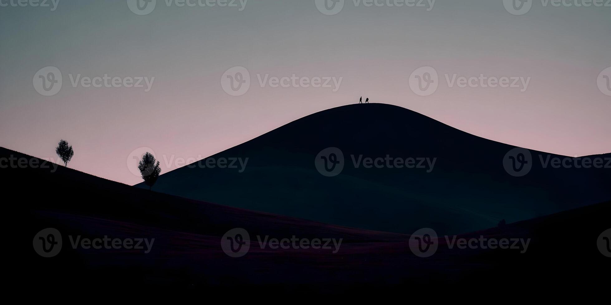 Two hikers are silhouetted on a majestic dark hill at twilight with subtle trees and a gradient sky creating a serene mood Pro Photo