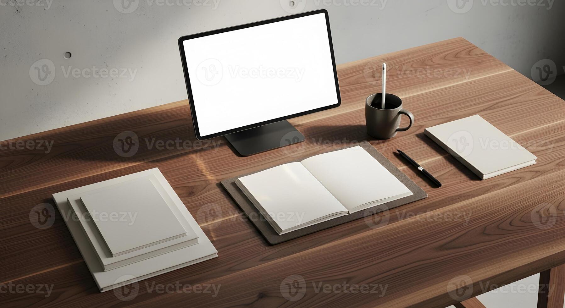 Modern workspace setup featuring a tablet open notebook and writing utensils on wooden desk Pro Photo