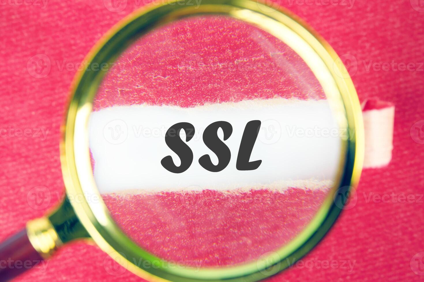 SSL Secure Sockets Layer through a magnifying glass under a torn piece of paper Pro Photo