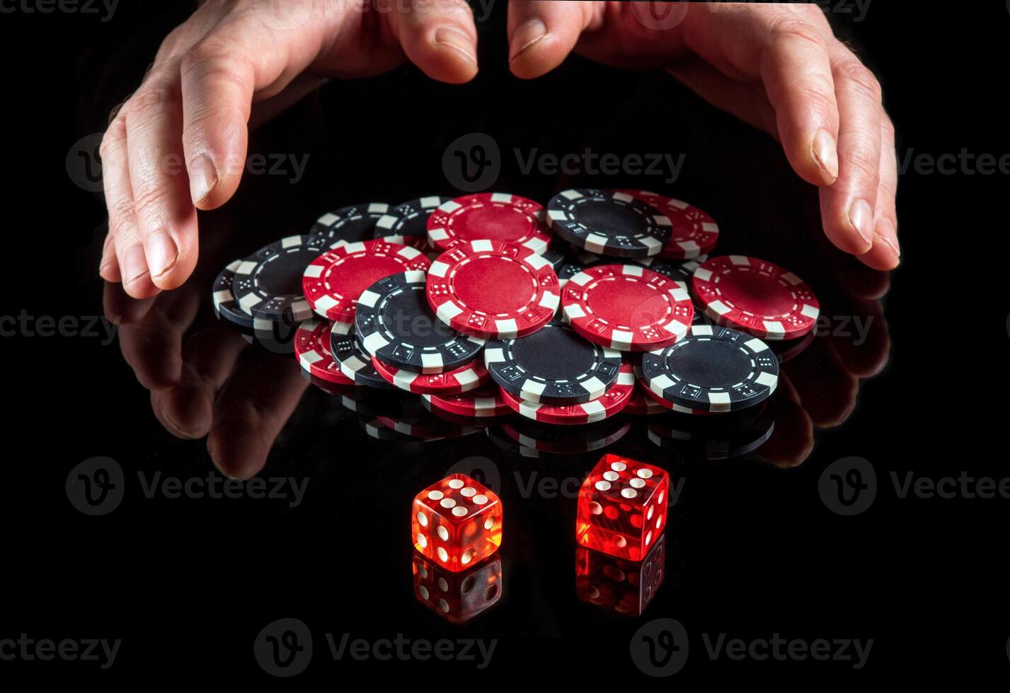 The dice with the maximum winning combination of twelve in Craps on the black table and the hands take the chips from the win Pro Photo