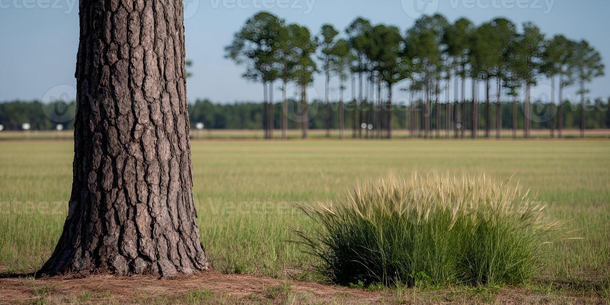A detailed view of a pine tree trunk standing tall in an open green field with a distant line of trees under a clear blue sky Pro Photo