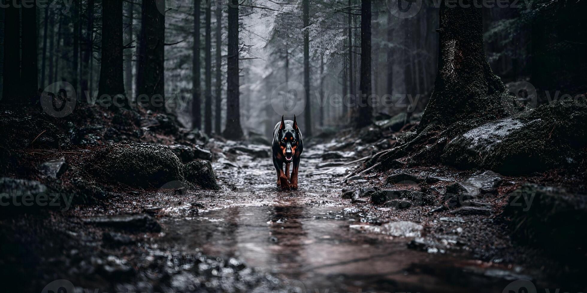 A powerful black Doberman dog with alert ears walks directly forward on a wet path in a dark moody forest Pro Photo