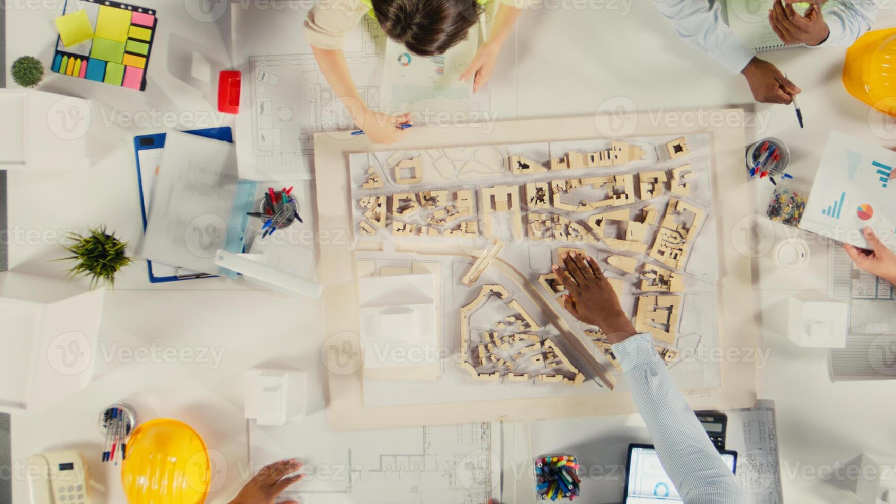 Top down view of developers and architects in business meeting reviewing blueprints and structural designs. Team discusses redevelopment and city planning for housing growth. Pro Photo