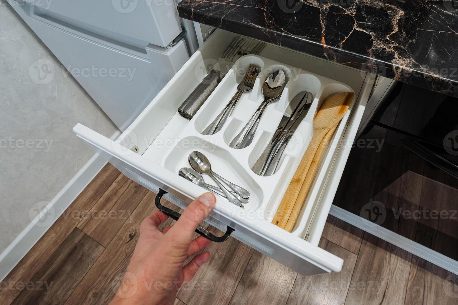 decluttering silverware drawers systematically, arranging utensils efficiently for cleanliness and easy access, strategically organizing kitchen utensils for maximum orderliness and convenience Pro Photo