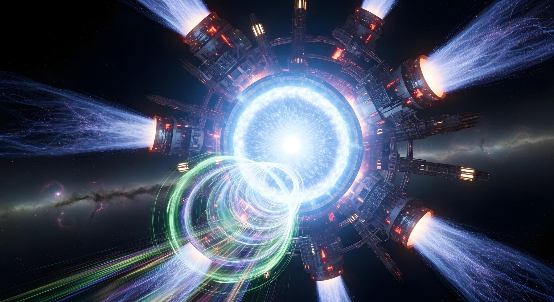 Vortex of cosmic energy emanating from a futuristic space engine, creating a mesmerizing gateway through the galaxy with vibrant light trails Free Photo