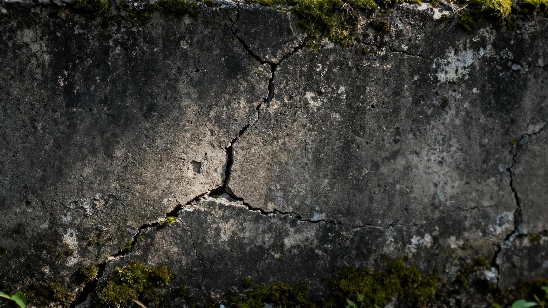 Deeply fractured and weathered concrete surface texture displays dark coloration and patches of green moss growth. Free Photo