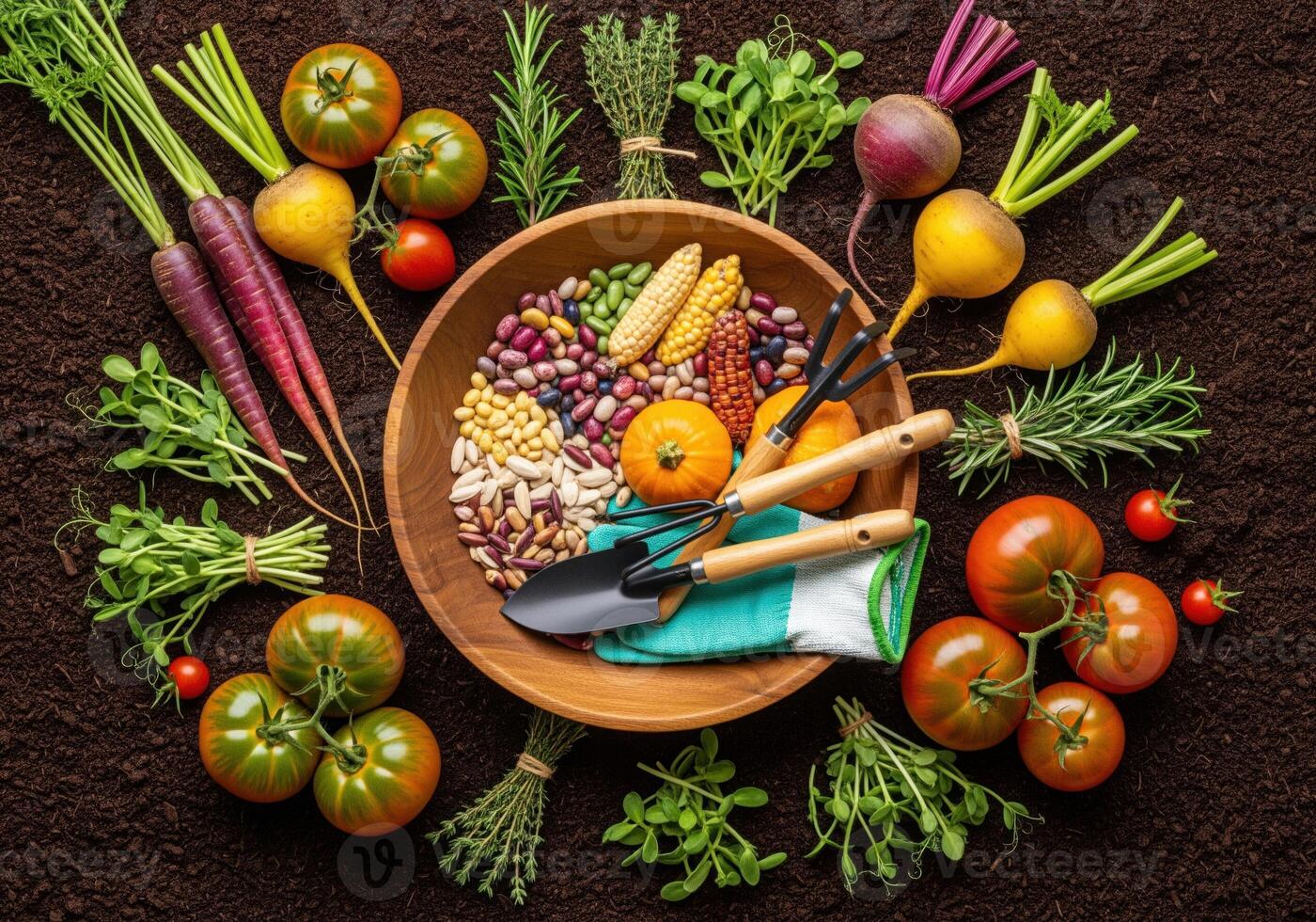 Vibrant array of fresh garden vegetables, assorted seeds, and farming tools on dark earth. Pro Photo
