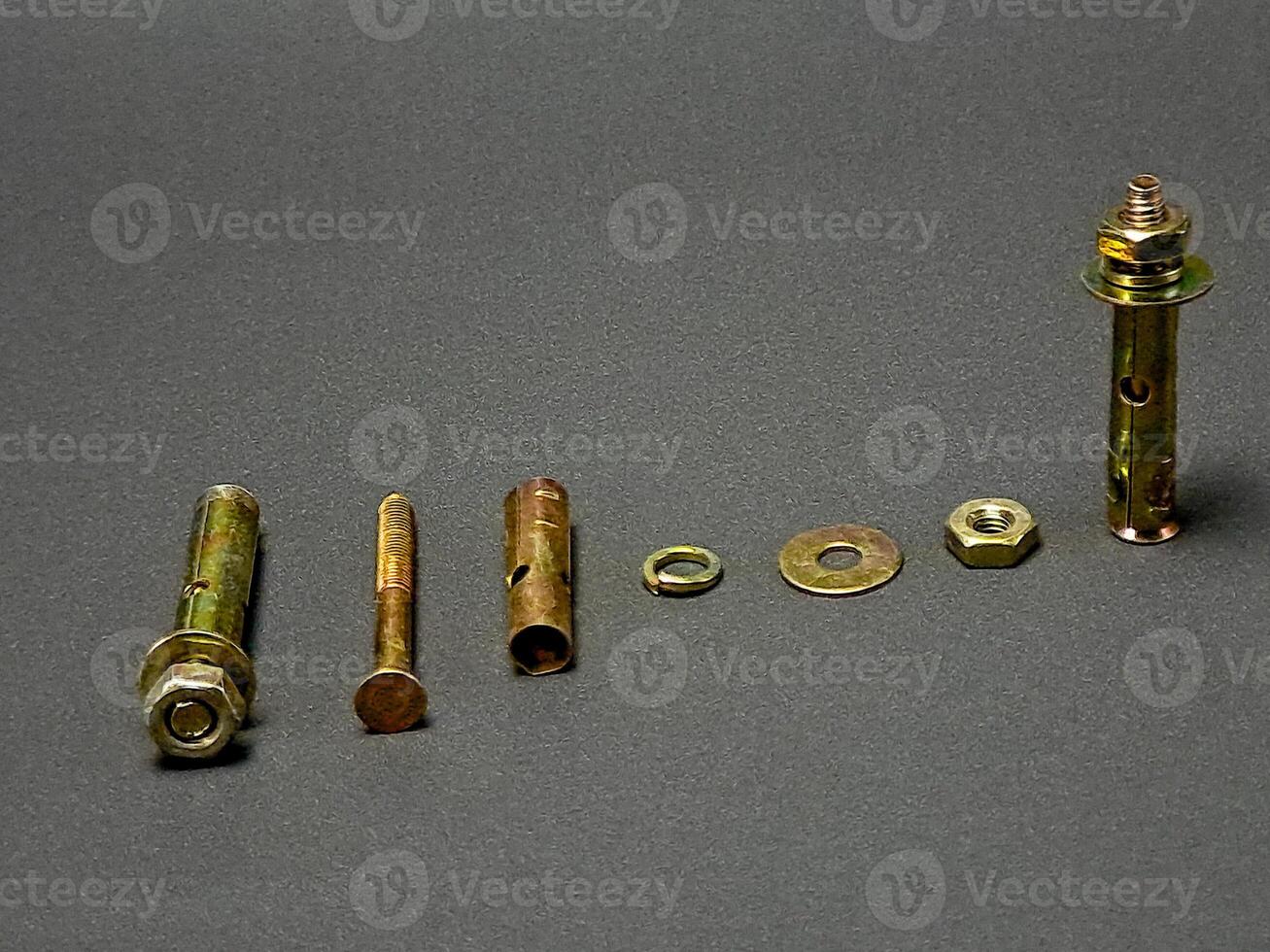 An array of metal fasteners neatly positioned on a dark gray surface displayed in a precise row. Pro Photo