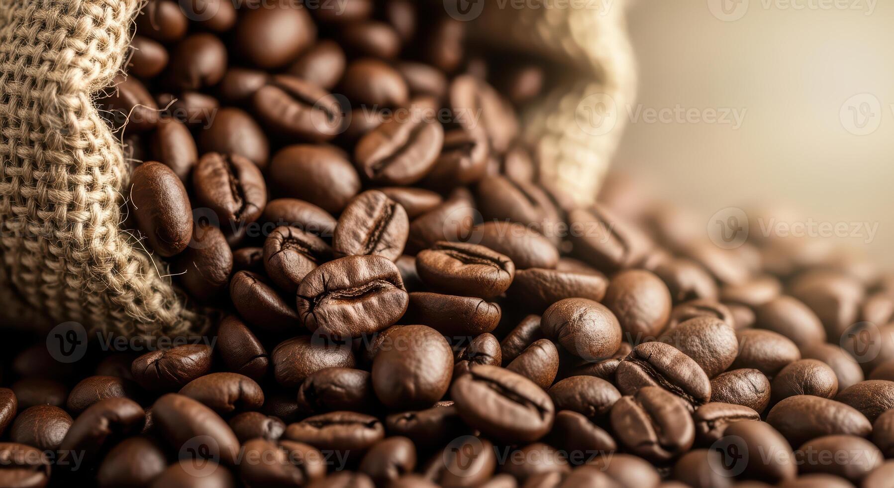 Heap of aromatic coffee beans spilling from burlap sack in rustic setting Pro Photo
