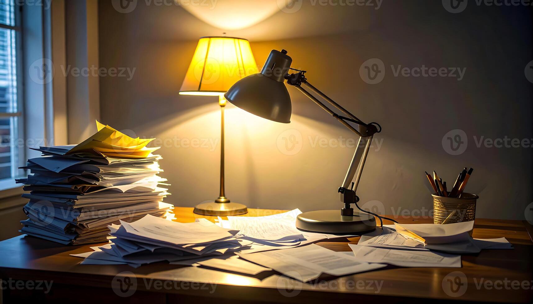 Cluttered desk illuminated by desk lamp and floor lamp, with stacks of papers and pen holder, creating busy workspace with warm lighting and shadows Pro Photo